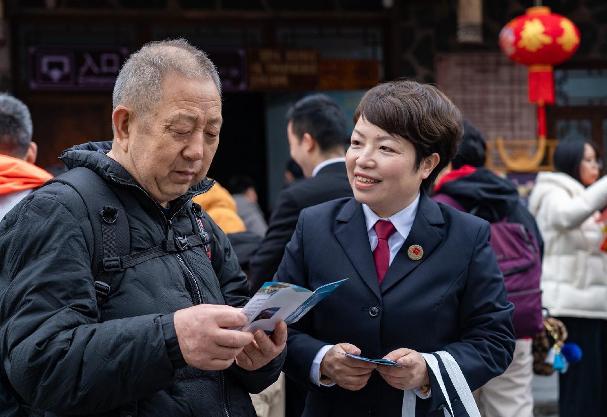 2月9日,貴州省黔東南苗族侗族自治州雷山縣司法局創(chuàng)新普法形式,將法律知識(shí)包裝成特色“年貨”,組織法治宣傳教育志愿者在景區(qū)開(kāi)展豐富多彩的新春法治宣傳。