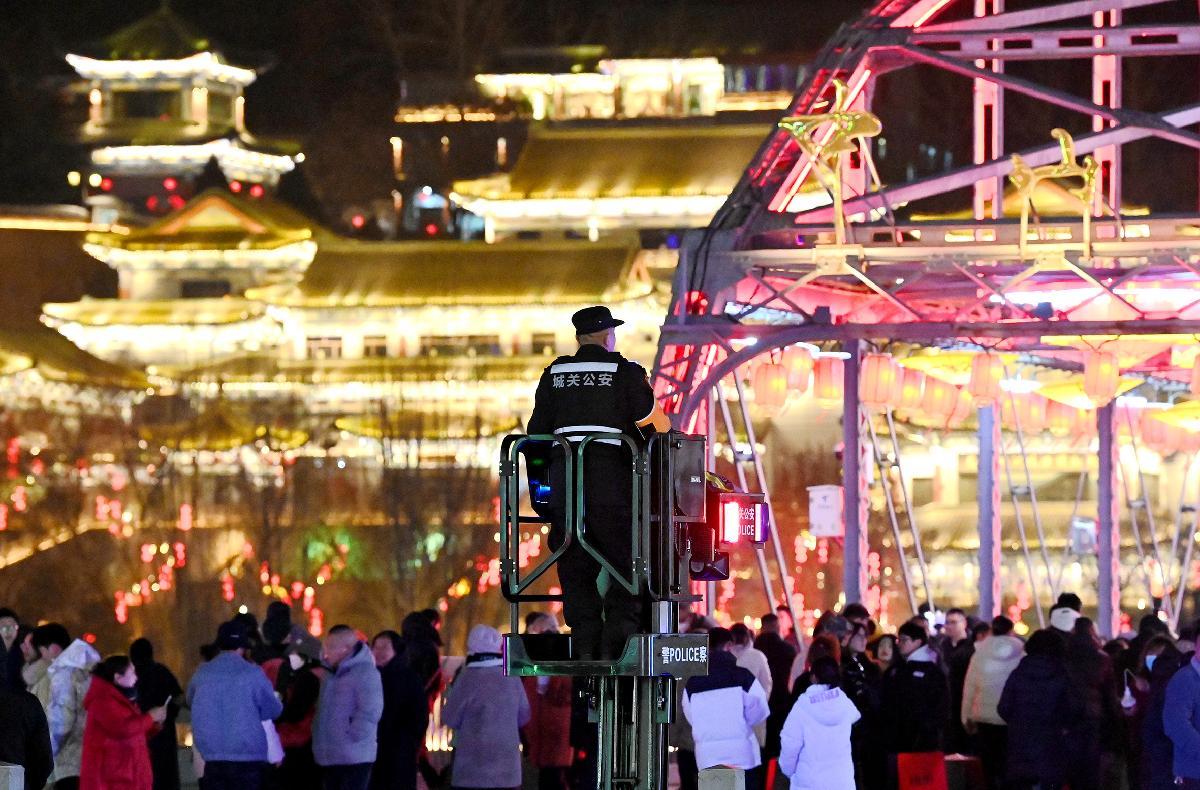 2月17日,河南省??h公安局民輔警在古城景區(qū)定點執(zhí)勤。