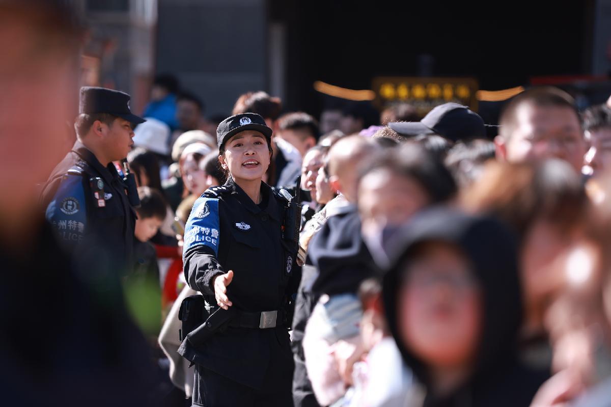 2月20日,甘肅省蘭州市公安局民輔警在蘭州老街非遺踩高蹺表演現(xiàn)場疏導客流、維護秩序。