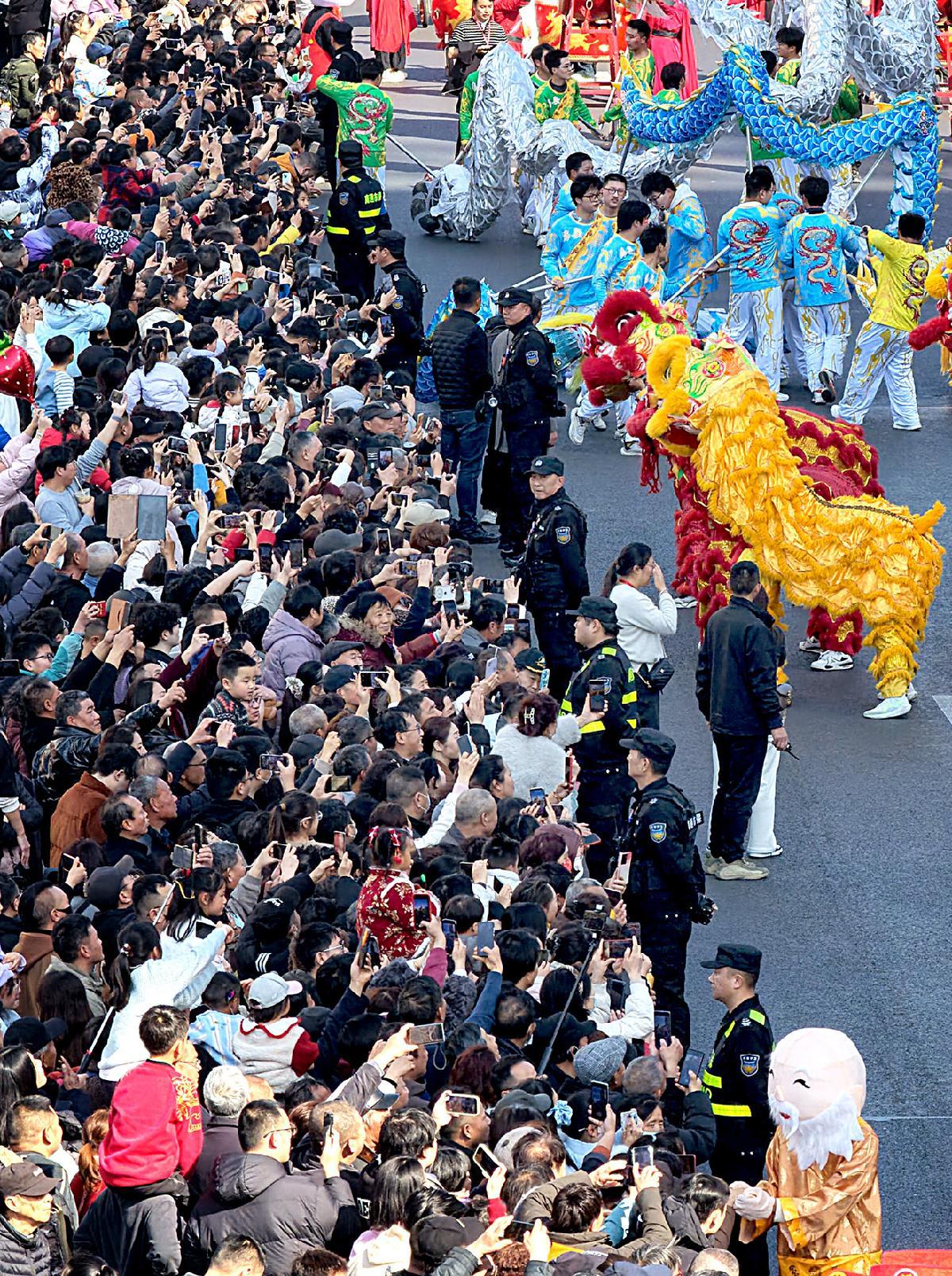 2月21日,江蘇省南通市公安局民輔警在新春民俗巡游活動現(xiàn)場執(zhí)勤。
