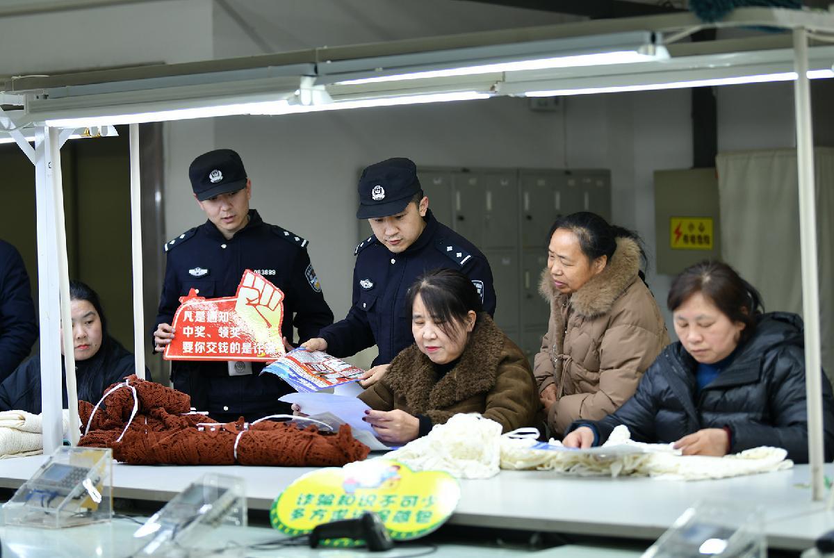 2月24日,安徽省阜南縣公安局經(jīng)濟(jì)開發(fā)區(qū)派出所民警在一家紡織企業(yè)車間為員工宣講防騙知識。