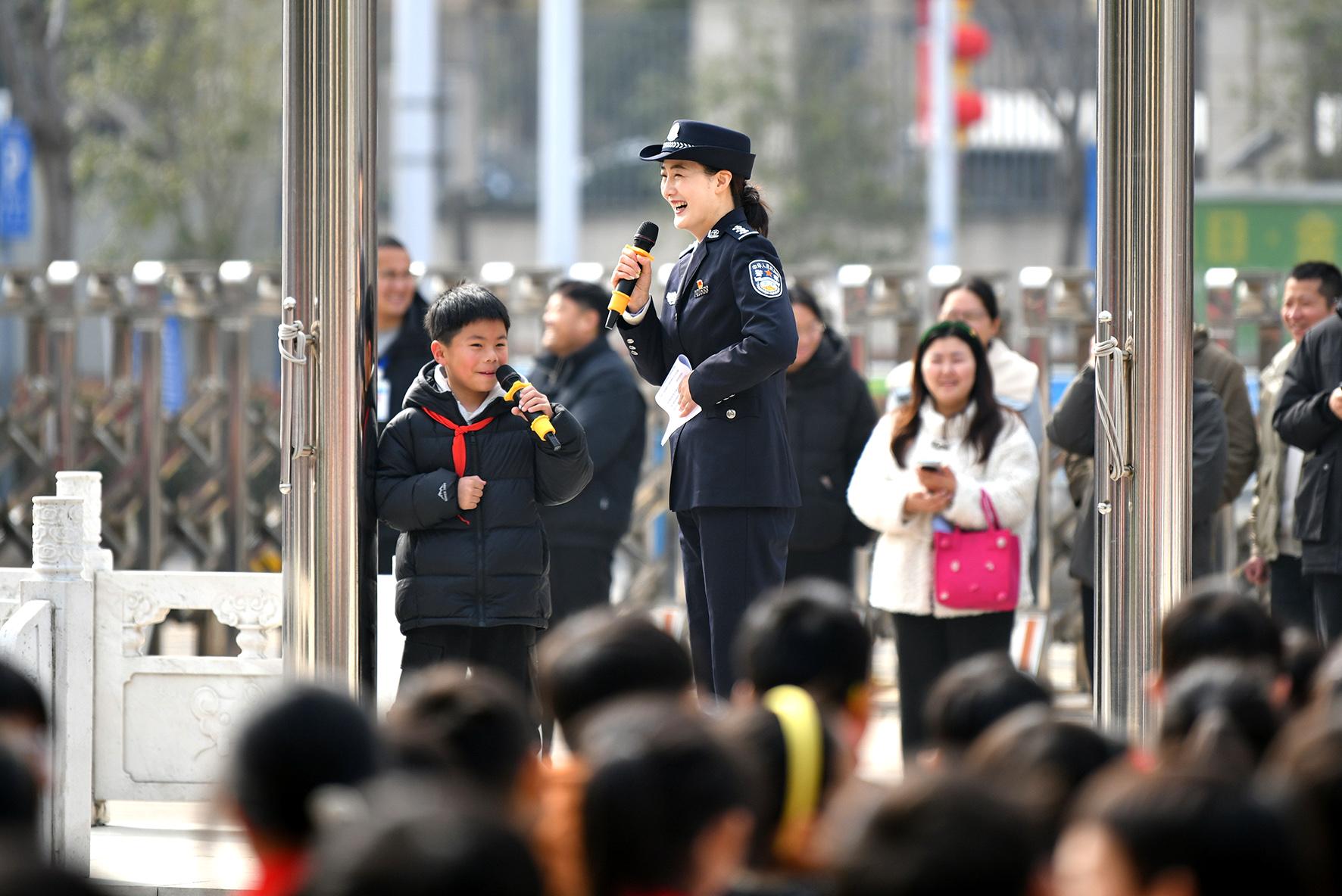 3月6日,安徽省阜南縣玉泉小學(xué)法治副校長、阜南縣公安局民警劉盛楠在校園為學(xué)生們宣講安全防范知識。