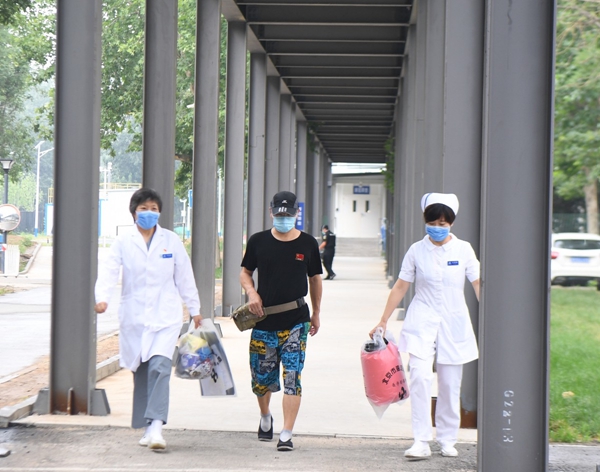 今天出院的老何戴著棒球帽,穿著黑色的短袖衫,綠底兒的沙灘褲,一身輕松。站在地壇醫(yī)院南門廣場,老何的口罩戴得嚴嚴實實,他說自己在新發(fā)地市場買點牛羊肉,口罩沒戴嚴實,“提醒咱們市民一定要做好防控,戴好口罩。”