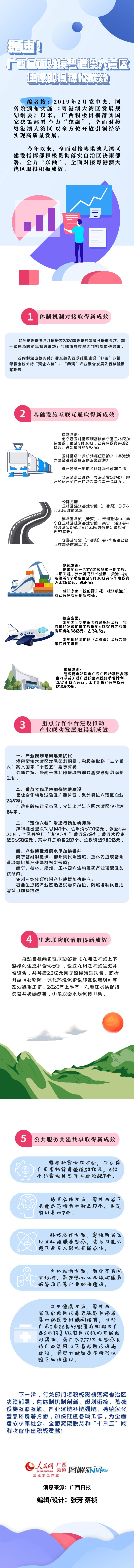 人民網南寧8月6日電 近日,廣西壯族自治區(qū)政府新聞辦召開的廣西全面對接粵港澳大灣區(qū)建設情況新聞發(fā)布會,會上透露,2019年2月黨中央、國務院頒布實施《粵港澳大灣區(qū)發(fā)展規(guī)劃綱要》以來,廣西積極貫徹落實國家決策部署,全力東融,全面對接粵港澳大灣區(qū),以全方位開放引領經濟實現高質量發(fā)展,在體制機制對接、基礎設施互聯互通、重點合作平臺建設推動產業(yè)聯動發(fā)展、生態(tài)聯防聯治、公共服務共建共享等五方面取得新成效。