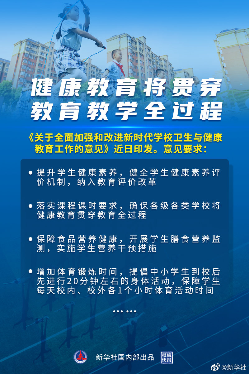 記者3日從教育部新聞發(fā)布會(huì)獲悉,《關(guān)于全面加強(qiáng)和改進(jìn)新時(shí)代學(xué)校衛(wèi)生與健康教育工作的意見(jiàn)》近日印發(fā)。意見(jiàn)要求,將健康教育與德育、智育、體育、美育、勞動(dòng)教育相結(jié)合,融入教育教學(xué)、管理服務(wù)全過(guò)程。①提升學(xué)生健康素養(yǎng),健全學(xué)生健康素養(yǎng)評(píng)價(jià)機(jī)制,納入教育評(píng)價(jià)改革。②明確健康教育內(nèi)容。③落實(shí)課程課時(shí)要求,確保各級(jí)各類(lèi)學(xué)校將健康教育貫穿教育全過(guò)程。④拓展健康教育渠道。⑤保障食品營(yíng)養(yǎng)健康,開(kāi)展學(xué)生膳食營(yíng)養(yǎng)監(jiān)測(cè),實(shí)施學(xué)生營(yíng)養(yǎng)干預(yù)措施。⑥增加體育鍛煉時(shí)間,提倡中小學(xué)生到校后先進(jìn)行20分鐘左右的身體活動(dòng),保障學(xué)生每天校內(nèi)、校外各1個(gè)小時(shí)體育活動(dòng)時(shí)間。⑦強(qiáng)化心理健康教育。⑧養(yǎng)成健康行為習(xí)慣。(記者胡浩,海報(bào)設(shè)計(jì)楊軼群)