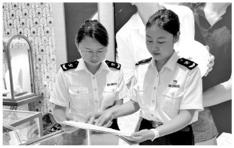 圖為??诤jP(guān)所屬三亞海關(guān)關(guān)員在三亞海旅免稅城進(jìn)行免稅品盤點。 本報記者 翟小功 攝