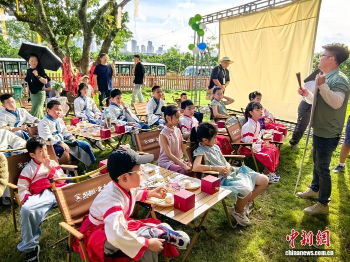 “投壺是古代宴飲時(shí)做的一種投擲游戲,也是一種禮儀,請(qǐng)大家站在這里,把手中的箭投向壺里,投中就可以得分……”在“51趣·北大”帳篷營(yíng)地,“少年行”研學(xué)機(jī)構(gòu)的老師戴曙正帶著約20名兒童開展研學(xué)活動(dòng)。