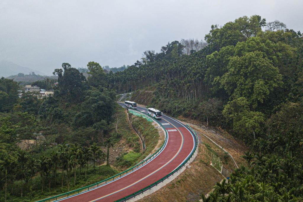 2025年2月21日,觀光巴士行駛在海南環(huán)熱帶雨林國家公園旅游公路瓊中段(無人機照片)。新華社記者 蒲曉旭 攝