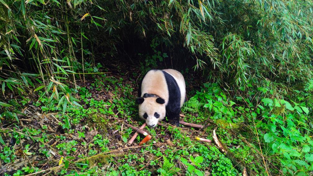 在位于大熊貓國家公園臥龍片區(qū)內(nèi)天臺山的大熊貓第二階段野化培訓(xùn)場內(nèi),雌性熊貓“輝輝”準(zhǔn)備吃投喂的竹筍和胡蘿卜(2024年6月9日攝)。新華社發(fā)(牟仕杰 攝)