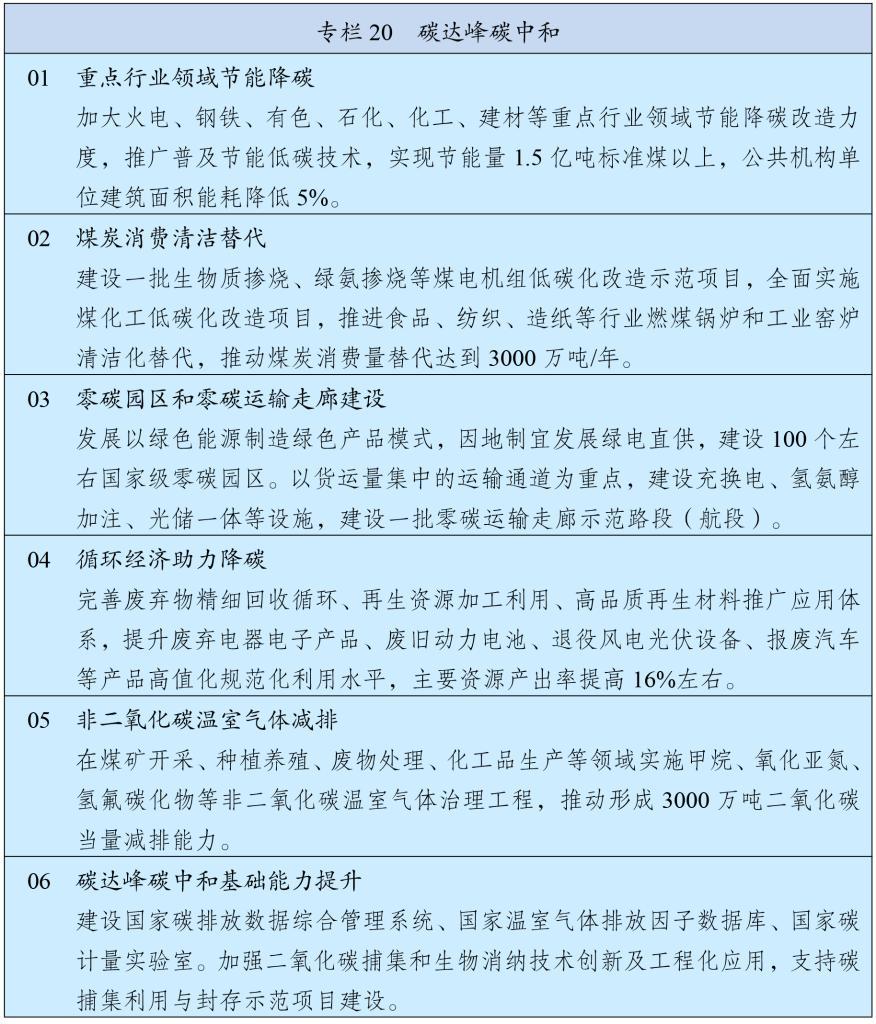 深入開展節(jié)能降碳改造和控煤減煤,加快推進(jìn)新增用電量由新增清潔能源電量覆蓋,推動煤炭和石油消費(fèi)達(dá)峰,單位GDP能耗下降10%左右。有力有效管控高耗能高排放項(xiàng)目,加快綠色低碳技術(shù)裝備創(chuàng)新應(yīng)用,有序推動符合要求的高載能產(chǎn)業(yè)向可再生能源資源富集區(qū)域轉(zhuǎn)移,建設(shè)零碳工廠和園區(qū)。加強(qiáng)既有建筑和市政設(shè)施節(jié)能降碳改造,促進(jìn)超低能耗和裝配式建筑規(guī)模化發(fā)展,實(shí)施制冷能效提升和綠色照明行動。加快熱力系統(tǒng)綠色低碳轉(zhuǎn)型,因地制宜開展余熱資源利用和非化石能源供熱,有序推進(jìn)供熱計(jì)量改造和按熱量收費(fèi)。推動交通動力低碳替代,加快貨運(yùn)、公共領(lǐng)域電動化和綠色燃料車船應(yīng)用,提高大宗貨物鐵路、水路運(yùn)輸比重和新能源汽車運(yùn)輸比重。提升算力設(shè)施、5G基站等新興領(lǐng)域用能效率。健全重點(diǎn)領(lǐng)域能效診斷機(jī)制,深入實(shí)施能效標(biāo)識和能效“領(lǐng)跑者”制度。深化綠色低碳高質(zhì)量發(fā)展先行區(qū)建設(shè)。