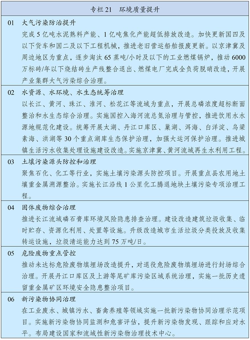 持續(xù)深入推進(jìn)污染防治攻堅(jiān),以更高標(biāo)準(zhǔn)改善大氣、水、土壤環(huán)境質(zhì)量。以京津冀及周邊、長三角、汾渭平原等重點(diǎn)區(qū)域?yàn)橹鲬?zhàn)場,強(qiáng)化細(xì)顆粒物(PM2.5)控制,深入推進(jìn)重點(diǎn)行業(yè)超低排放改造,推動揮發(fā)性有機(jī)物源頭替代和全流程治理,制定下一階段機(jī)動車排放和油品質(zhì)量標(biāo)準(zhǔn),深化大氣環(huán)境績效分級管理,氮氧化物、揮發(fā)性有機(jī)物排放量分別下降8%以上,進(jìn)一步消除重污染天氣。加強(qiáng)長江中游、成渝等區(qū)域大氣污染防治。加強(qiáng)餐飲油煙、惡臭異味和環(huán)境噪聲污染治理。統(tǒng)籌水資源、水環(huán)境、水生態(tài)治理,以解決全流域和跨省界突出問題為重點(diǎn),加強(qiáng)重要江河湖庫系統(tǒng)治理和生態(tài)保護(hù),基本完成重點(diǎn)流域海域入河入海排污口排查整治,化學(xué)需氧量、總磷排放量分別下降6%,鞏固城市黑臭水體治理成效、基本消除縣鄉(xiāng)黑臭水體。加強(qiáng)土壤污染源頭防控,推進(jìn)受污染耕地、建設(shè)用地安全利用。