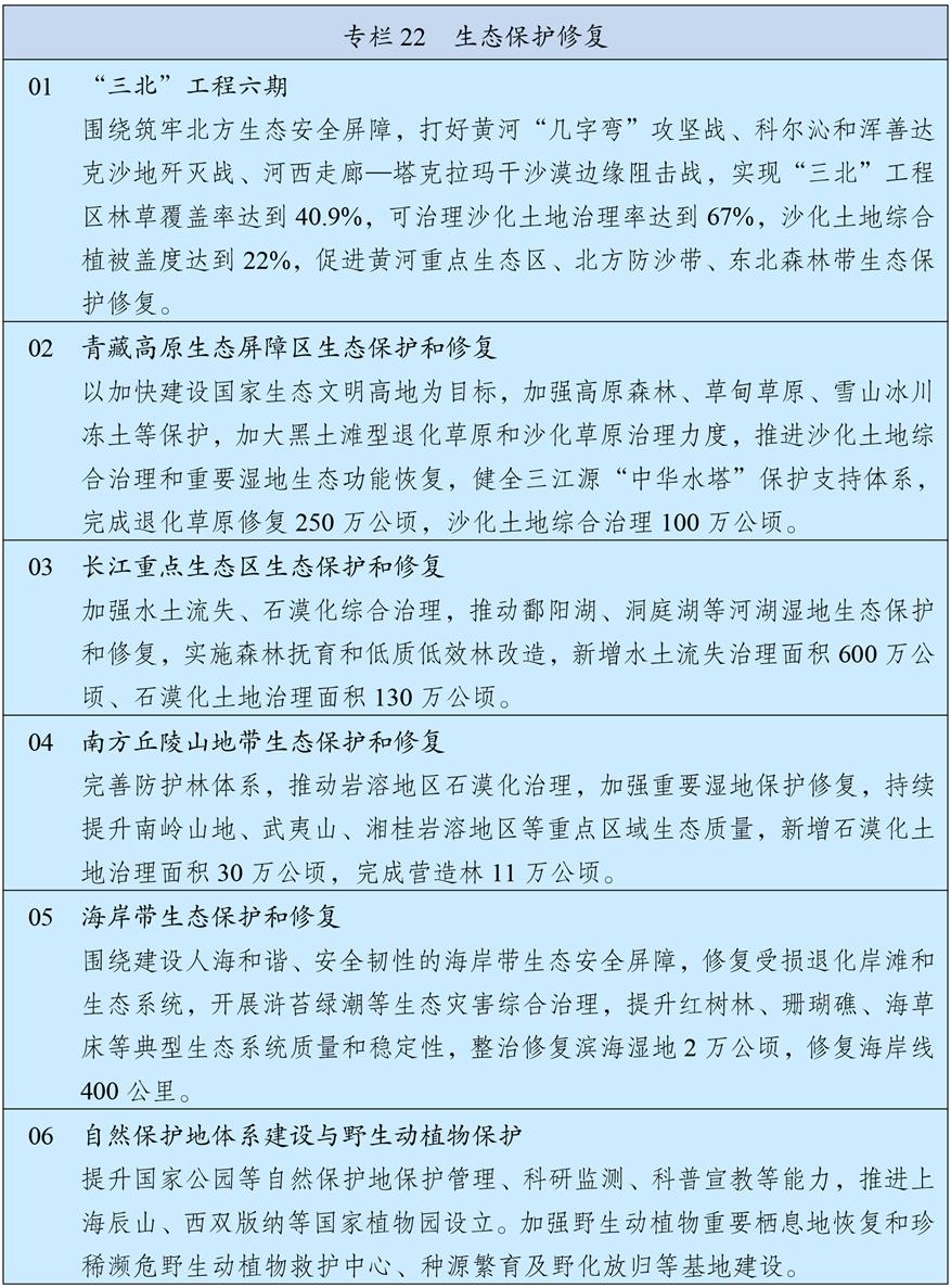 統(tǒng)籌推進(jìn)重要生態(tài)系統(tǒng)保護(hù)和修復(fù)重大工程,持續(xù)鞏固以“三區(qū)四帶”為骨架的國家生態(tài)安全屏障體系。打好“三北”工程攻堅(jiān)戰(zhàn),推動三大標(biāo)志性戰(zhàn)役取得決定性勝利。深入推進(jìn)青藏高原生態(tài)保護(hù),加強(qiáng)重點(diǎn)區(qū)域水土流失治理和石漠化治理??茖W(xué)開展大規(guī)模國土綠化行動,推進(jìn)森林質(zhì)量精準(zhǔn)提升和國家儲備林建設(shè),森林蓄積量達(dá)到224億立方米,統(tǒng)籌草原生態(tài)修復(fù)與合理利用,加強(qiáng)濕地保護(hù)修復(fù)。推進(jìn)超引地表水和超采地下水治理,開展歷史遺留廢棄礦山生態(tài)修復(fù)。