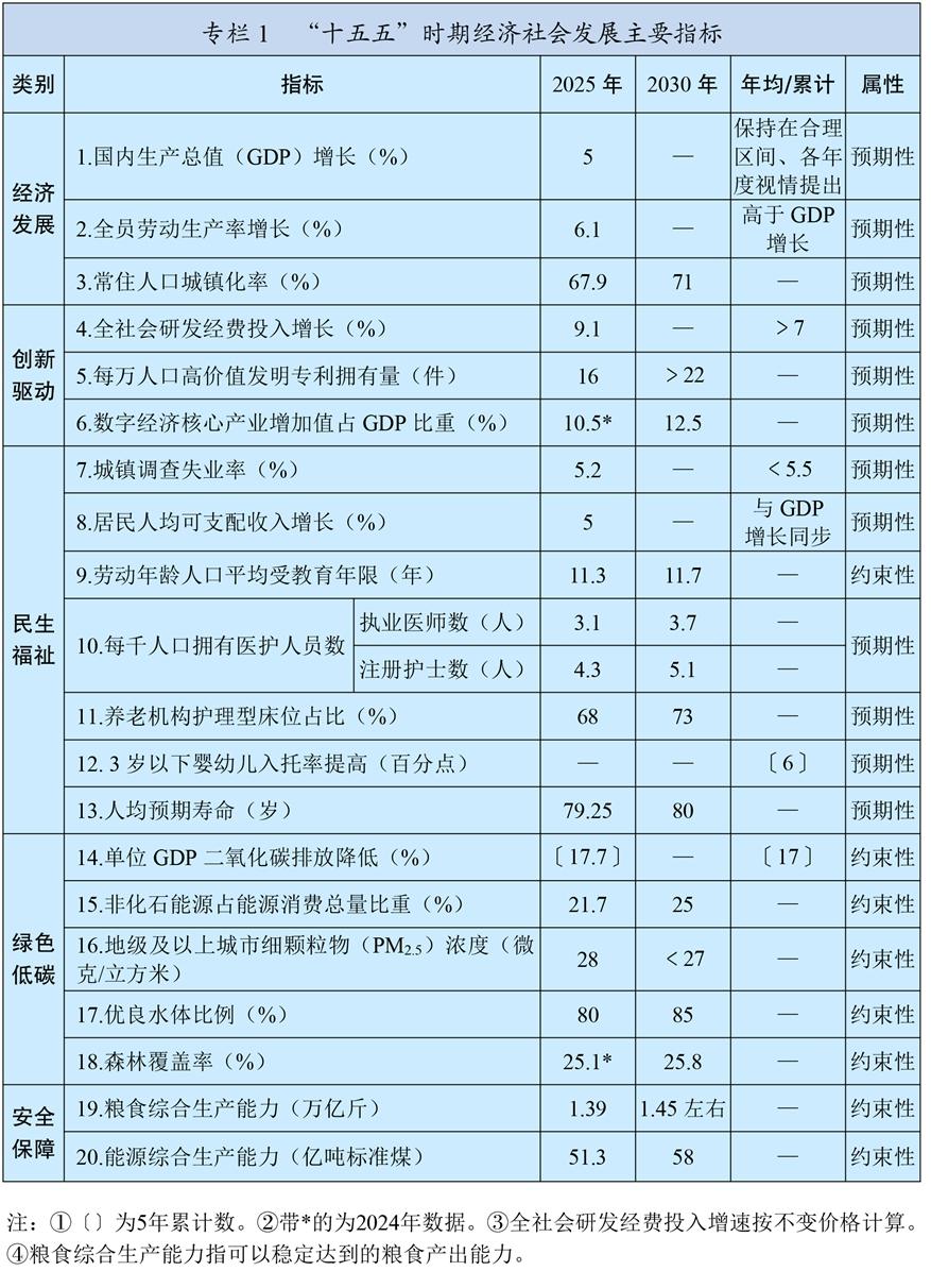 新發(fā)展理念引領(lǐng)作用全面彰顯,構(gòu)建新發(fā)展格局邁出重要步伐,新質(zhì)生產(chǎn)力穩(wěn)步發(fā)展,高質(zhì)量發(fā)展扎實(shí)推進(jìn)。經(jīng)濟(jì)運(yùn)行穩(wěn)中有進(jìn),國內(nèi)生產(chǎn)總值突破140萬億元,現(xiàn)代化產(chǎn)業(yè)體系建設(shè)取得重大進(jìn)展,基礎(chǔ)設(shè)施支撐能力不斷提升,數(shù)字經(jīng)濟(jì)核心產(chǎn)業(yè)增加值占比超過10.5%,城鄉(xiāng)區(qū)域發(fā)展平衡性協(xié)調(diào)性增強(qiáng)??萍紕?chuàng)新成果豐碩,全社會研發(fā)經(jīng)費(fèi)投入強(qiáng)度達(dá)到2.8%,攻克一批重大關(guān)鍵核心技術(shù),取得一批重大原創(chuàng)科技成果。全面深化改革進(jìn)一步推進(jìn),落實(shí)“兩個(gè)毫不動搖”的體制機(jī)制不斷完善,全國統(tǒng)一大市場建設(shè)取得積極成效,宏觀經(jīng)濟(jì)治理效能進(jìn)一步提升。高水平對外開放不斷擴(kuò)大,開放型經(jīng)濟(jì)新體制加快形成,高質(zhì)量共建“一帶一路”走深走實(shí)。全過程人民民主深入發(fā)展,全面依法治國有效實(shí)施。文化事業(yè)和文化產(chǎn)業(yè)蓬勃發(fā)展,精神文化產(chǎn)品豐富多彩。民生保障扎實(shí)穩(wěn)固,居民人均可支配收入年均增長5.4%,城鎮(zhèn)新增就業(yè)累計(jì)達(dá)到6242萬人,勞動年齡人口平均受教育年限達(dá)到11.3年,人均預(yù)期壽命提升至79歲以上,脫貧攻堅(jiān)成果鞏固拓展。綠色低碳轉(zhuǎn)型步伐加快,生態(tài)環(huán)境質(zhì)量持續(xù)改善,非化石能源發(fā)電裝機(jī)容量超過化石能源,地級及以上城市細(xì)顆粒物(PM2.5)濃度降至28微克/立方米,地表水達(dá)到或好于Ⅲ類水體比例超過90%,森林覆蓋率超過25%。國家安全能力有效提升,糧食產(chǎn)量邁上1.4萬億斤大臺階,社會治理效能增強(qiáng),社會大局保持穩(wěn)定。國防和軍隊(duì)建設(shè)取得重大進(jìn)展?!耙粐鴥芍啤睂?shí)踐深入推進(jìn)。中國特色大國外交全面拓展。全面從嚴(yán)治黨成效顯著,反腐敗斗爭縱深推進(jìn),黨的創(chuàng)造力、凝聚力、戰(zhàn)斗力明顯提高。