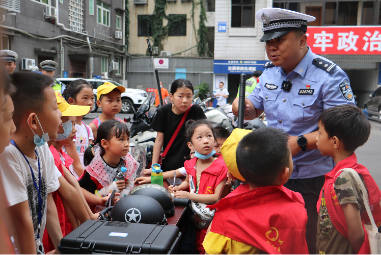 為做好暑期道路交通安全宣傳工作,增強未成年人的交通安全意識,7月14日上午,四川省綿陽市公安局交警支隊直屬一大隊組織本地報社的“小記者”們到大隊參觀、采訪。活動中,民警向“小記者”們介紹交警工作,講解交通安全知識,還為他們展示酒精測試儀、防暴盾牌、臂盾等執(zhí)法裝備,并進行現(xiàn)場演示。圖為民警與“小記者”互動。