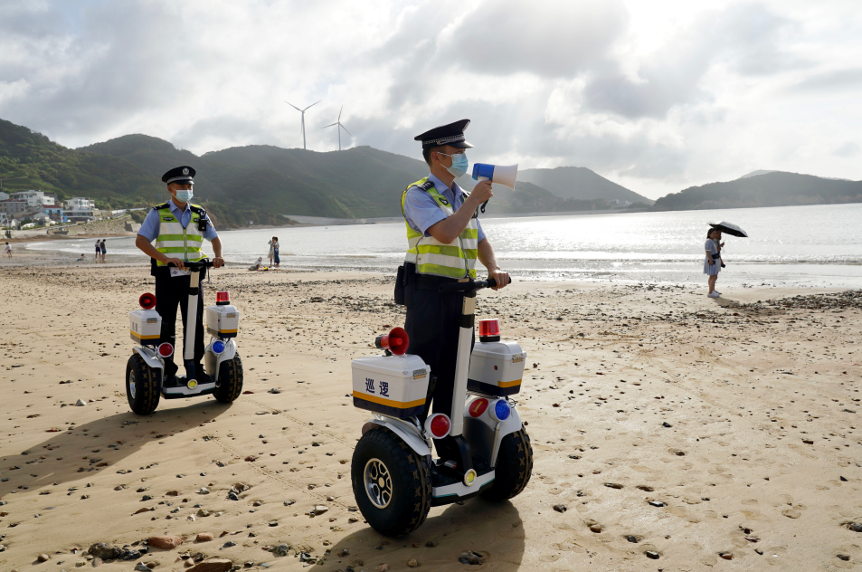 8月5日,浙江省岱山縣公安局羅家岙派出所民警頭頂烈日在轄區(qū)涼峙沙灘巡邏執(zhí)勤,開展相關法律知識宣傳,提醒在海邊游玩的游客注意天氣變化,守護游客生命財產平安。圖為民警在巡邏執(zhí)勤。