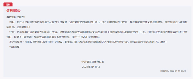 經(jīng)查,信豐縣城區(qū)通往高鐵西站的濱江大道、信雄大道和城南大道路燈均因受周邊項目施工造成線纜損壞影響導致路燈不亮,濱江大道和信雄大道路燈均已維修好,于2022年1月19日恢復了正常照明。