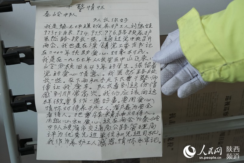 一名養(yǎng)護工人經常搭坐民警的順風車,為中隊送來了感謝信。人民網記者 吳超攝
