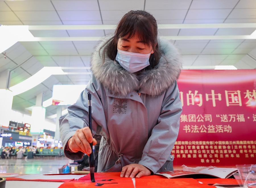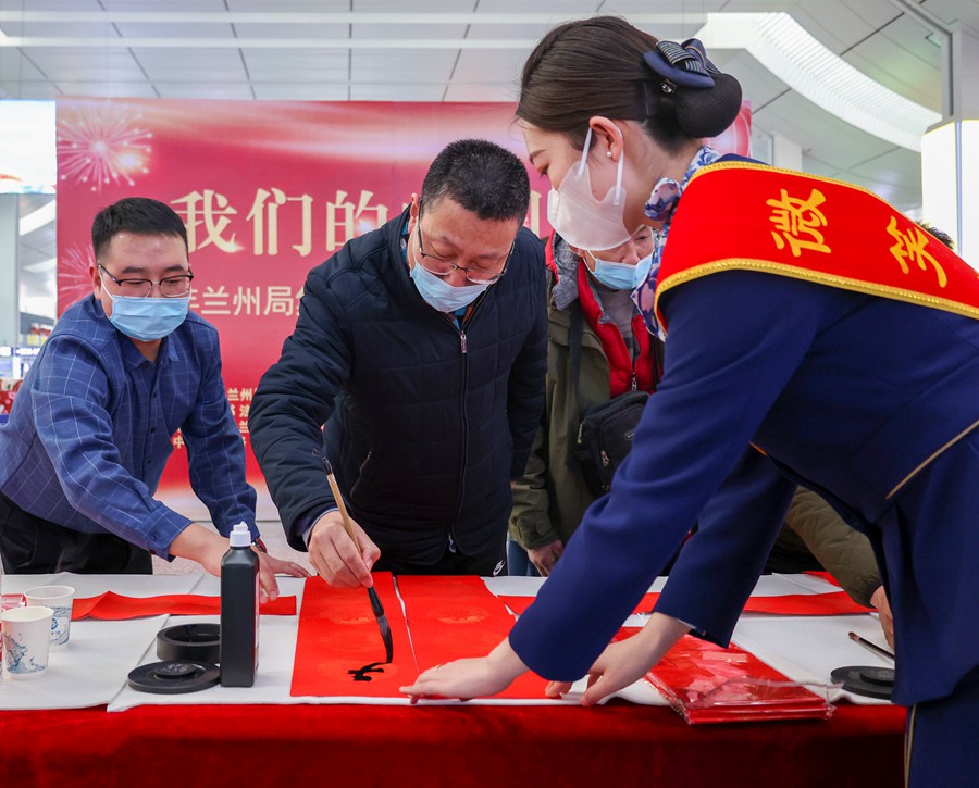 為實現(xiàn)“平安春運、有序春運、溫馨春運,讓旅客體驗更美好”的春運目標(biāo),1月25日蘭州鐵路局在蘭州火車站、蘭州西站開展了以“我們的中國夢”為主題的“送萬?!みM(jìn)萬家”書法公益活動?;顒赢?dāng)天,甘肅省的20余名書法家、藝術(shù)家筆走龍蛇、揮毫潑墨,現(xiàn)場創(chuàng)作春聯(lián)和“?!弊?,為候車旅客送上新春的祝福。