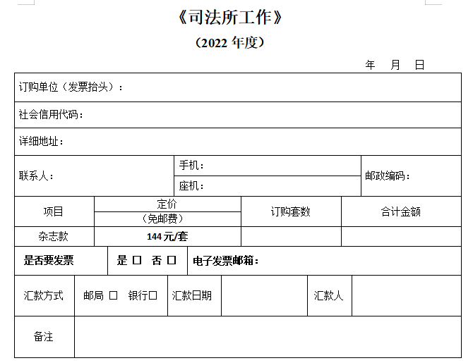 單位匯款時(shí)請(qǐng)務(wù)必標(biāo)明“司法所工作+訂購套數(shù)”,個(gè)人匯款請(qǐng)務(wù)必注明“單位名稱+中國司法”。