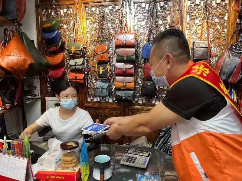 圖為廣州市白云區(qū)的社矯對象成為法治宣傳員,到皮具商鋪進行法治宣傳。