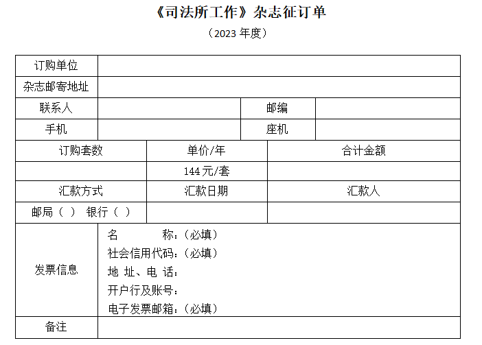 若不能進(jìn)行在線提交訂單,請(qǐng)將本征訂單填寫完整后與匯款憑證一并發(fā)郵件至sfsgzfxb@126.com;或添加微信13681283507后發(fā)送電子版征訂單與匯款憑證。