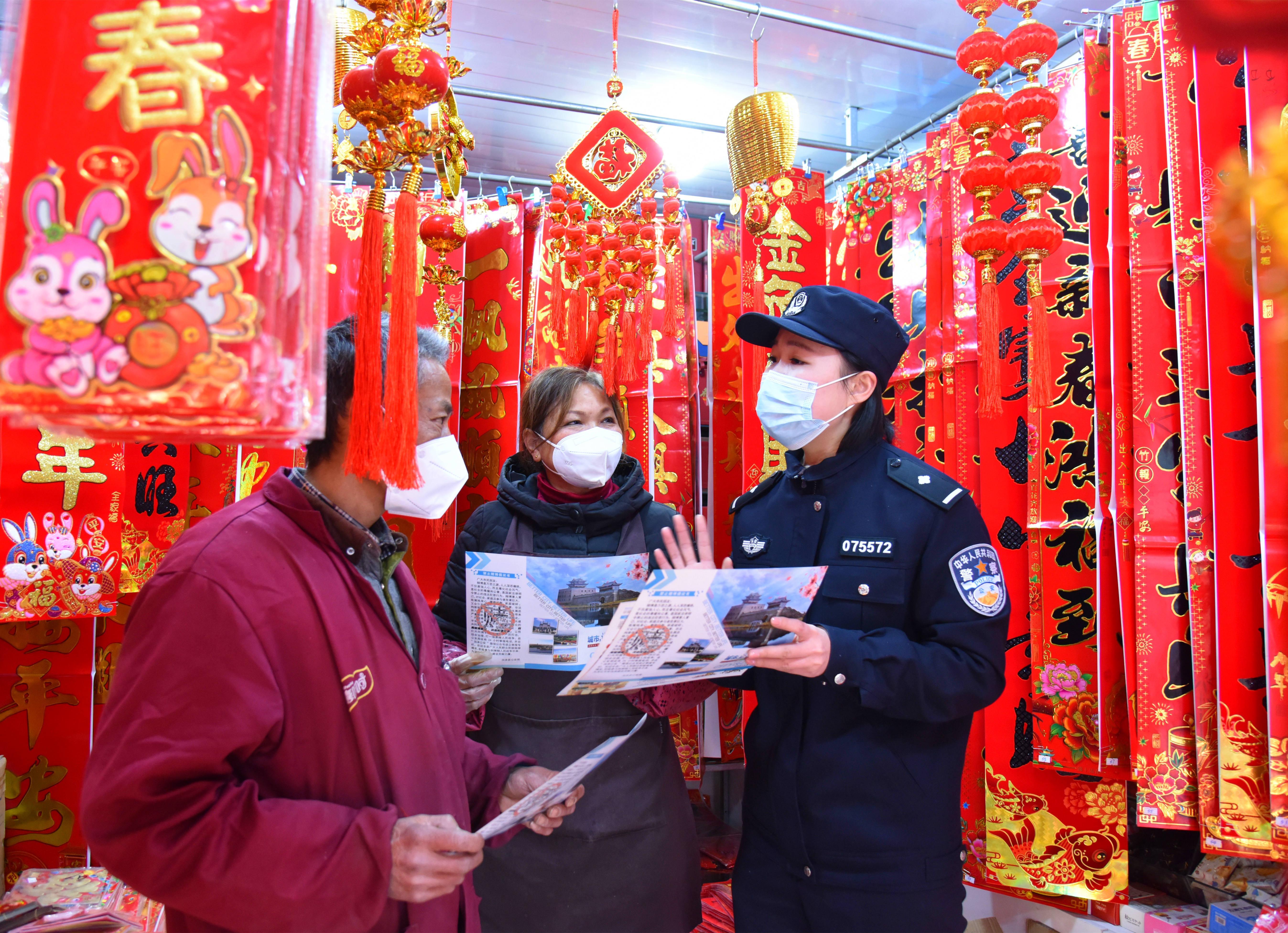 春節(jié)來臨,正值群眾購置年貨的高峰期,安徽省當(dāng)涂縣公安局姑孰派出所民警深入轄區(qū)年貨市場,向經(jīng)營戶宣傳防火、防騙、防盜等平安常識,全力守護(hù)轄區(qū)年貨市場平安繁榮,確保人民群眾歡度新春佳節(jié)。圖為1月4日,民警走訪年貨市場店主,開展禁毒禁賭安全防范宣傳。