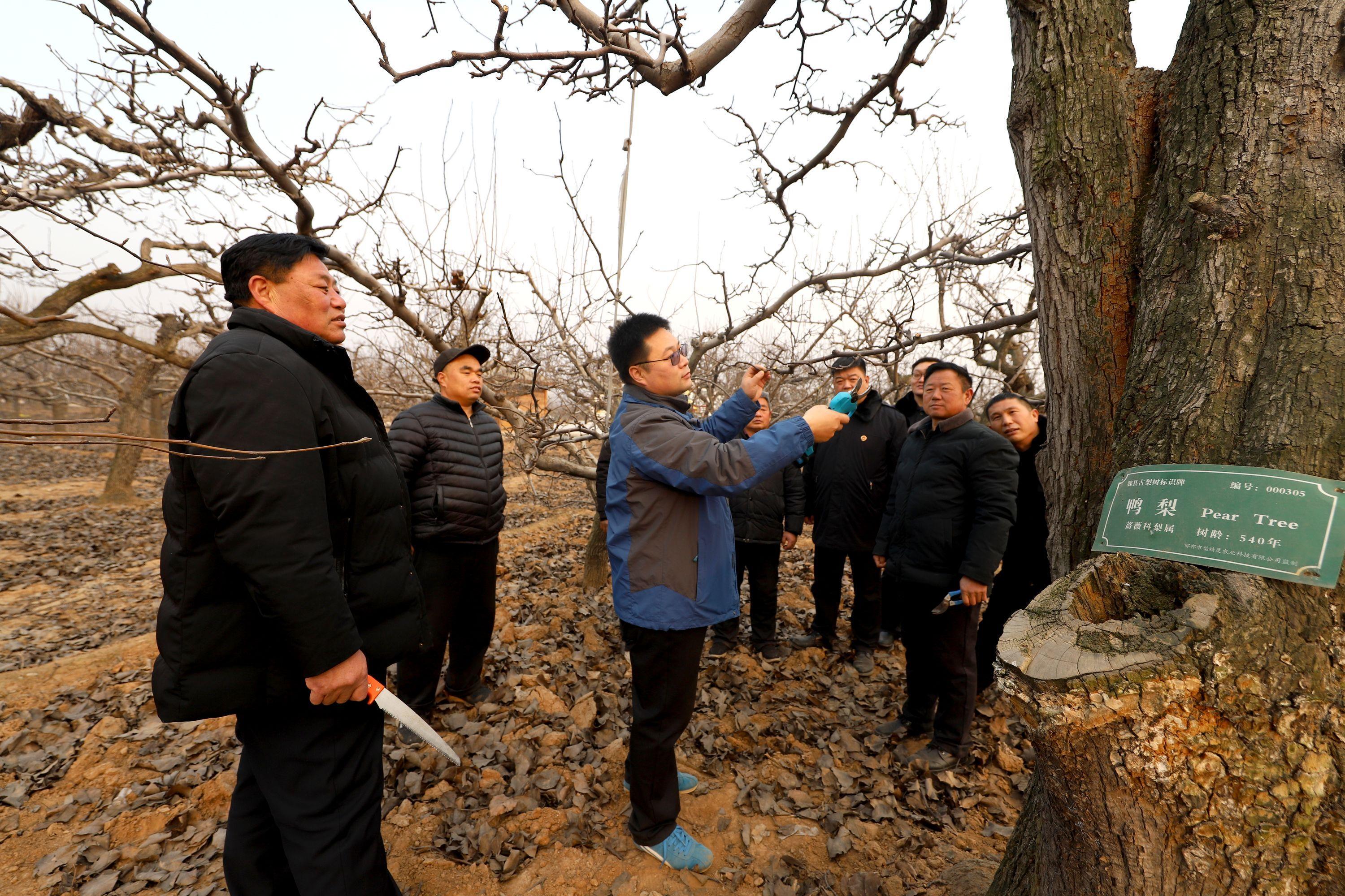 1月4日,河北省魏縣人民檢察院公益訴訟檢察官邀請該縣林果服務中心果樹專家來到東南溫村梨園,指導梨農對古梨樹進行冬季剪枝整枝管理,為明年古梨樹豐產、梨農增收做好準備。圖為專家向梨農講解古梨樹的修剪要求和技巧。