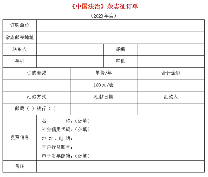 ★若不能進(jìn)行在線提交訂單,請(qǐng)將本征訂單填寫完整后與匯款憑證一并發(fā)郵件至zgsffxb@126.com;或添加微信13671053926后發(fā)送電子版征訂單與匯款憑證。