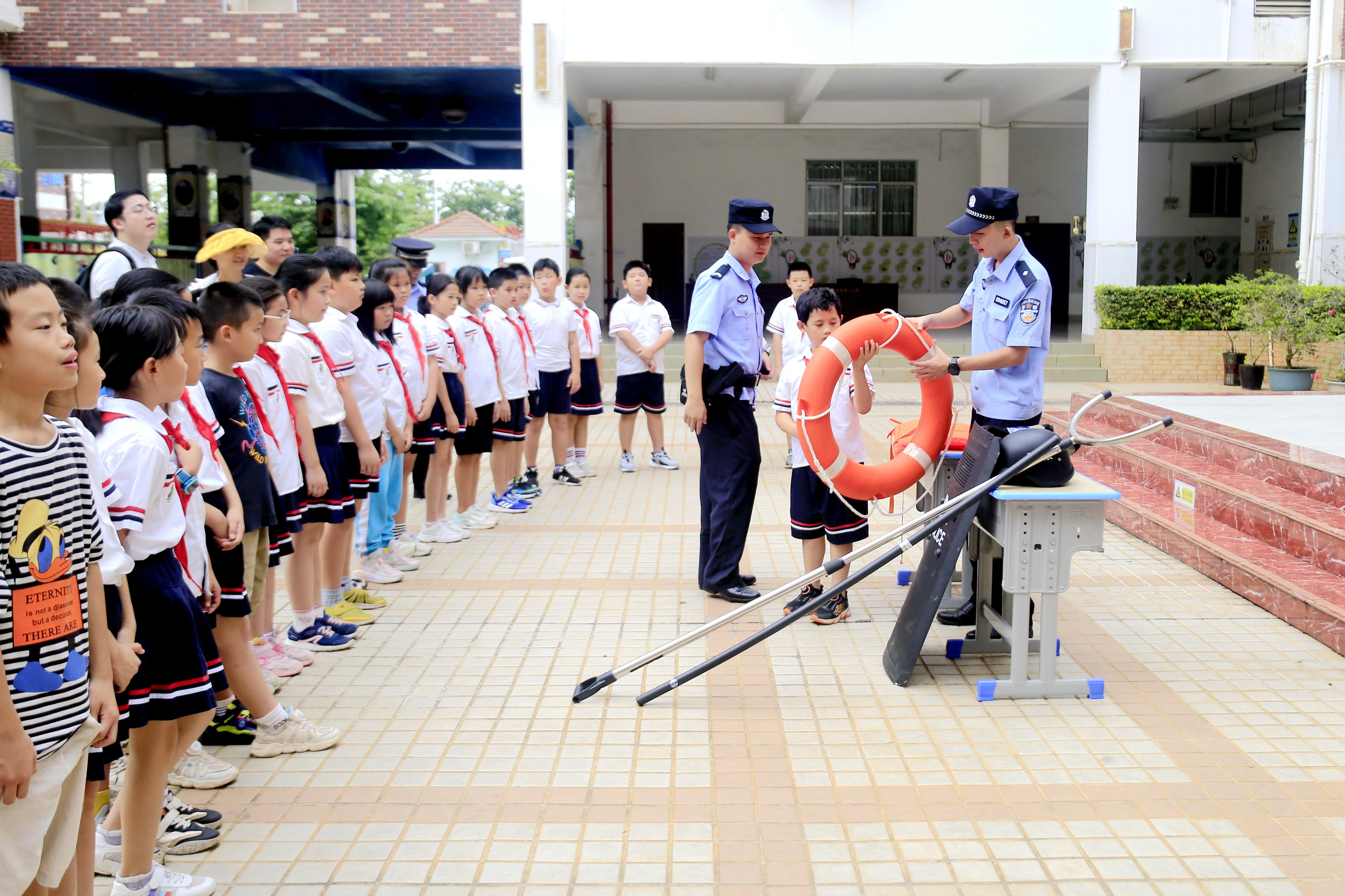 暑期到來之際,海南省儋州市公安局洋浦經(jīng)濟(jì)開發(fā)區(qū)分局新英灣海岸派出所民警結(jié)合全省未成年人“護(hù)苗”專項(xiàng)行動(dòng)和“安全生產(chǎn)月”活動(dòng),精心準(zhǔn)備,到洋浦第一小學(xué)開展防溺水安全宣傳教育,為師生們送上暑期防溺水安全知識“大禮包”。圖為民警向同學(xué)們講解防溺水知識。