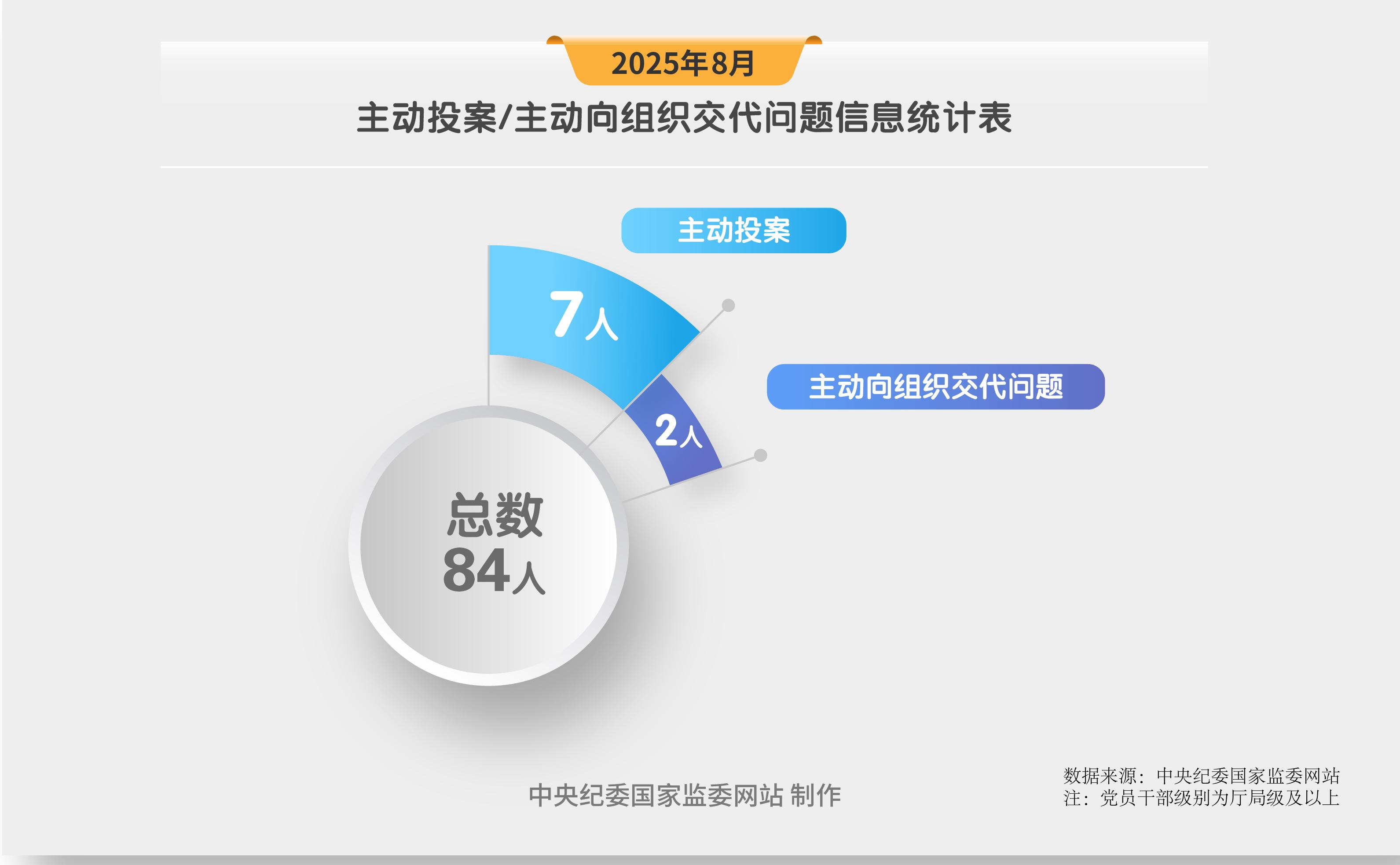 2025年8月,中央紀(jì)委國(guó)家監(jiān)委網(wǎng)站發(fā)布的審查調(diào)查信息中,7名黨員領(lǐng)導(dǎo)干部主動(dòng)投案,2名黨員領(lǐng)導(dǎo)干部主動(dòng)向組織交代問題。