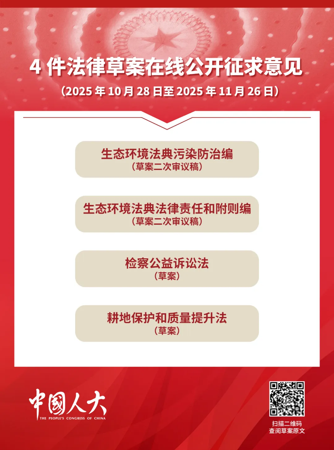 今天起,4件法律草案公開(kāi)征求意見(jiàn),截止日期為2025年11月26日。