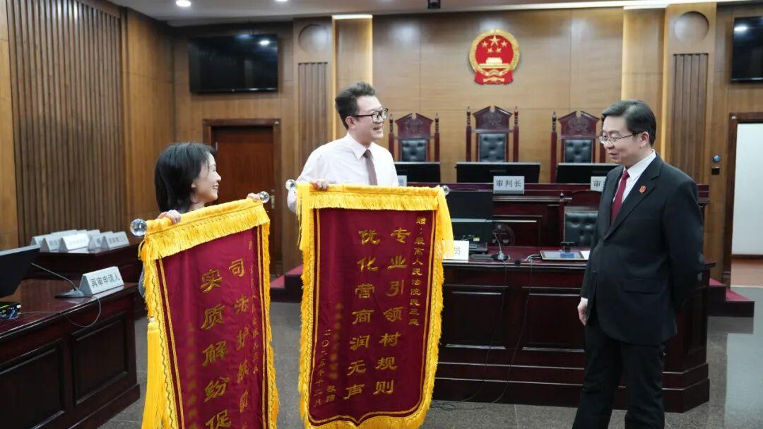 2025年12月24日,最高人民法院第六法庭里,褪去了平日里開庭的嚴肅,露出鮮有的平和氛圍。楊女士和祁先生各自代表平臺公司和電視公司,分別向最高人民法院民三庭、承辦法官團隊贈送錦旗。民三庭庭長李劍代表最高法民三庭接受了錦旗,戴怡婷法官團隊接受了贈旗。