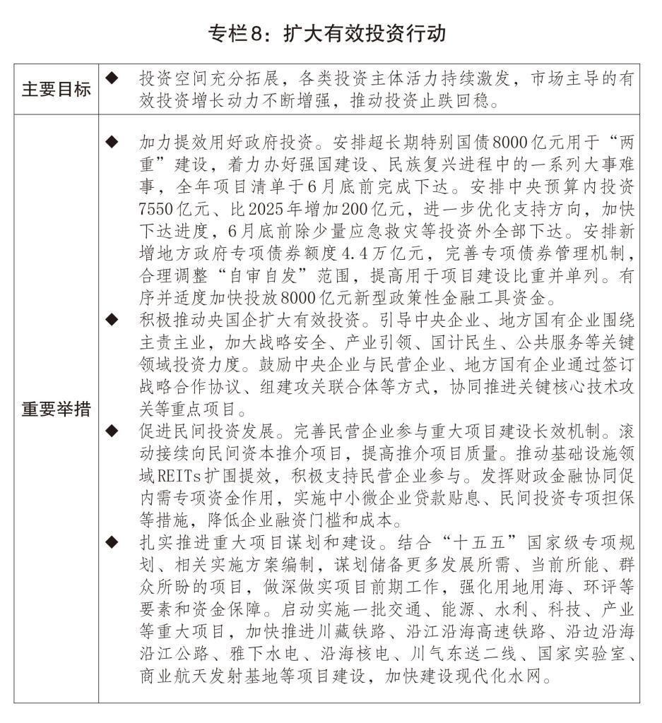 二是投資補短板調(diào)結(jié)構(gòu)加力增效。統(tǒng)籌用好各類資金支持重點項目建設(shè),持續(xù)優(yōu)化中央預(yù)算內(nèi)投資結(jié)構(gòu),擴大地方政府專項債券投向領(lǐng)域和用作資本金范圍,指導(dǎo)專項債券“自審自發(fā)”地區(qū)扎實有序開展相關(guān)工作。推動“十四五”規(guī)劃102項重大工程項目順利實現(xiàn)規(guī)劃目標(biāo)任務(wù),開工建設(shè)雅下水電等標(biāo)志性工程?,F(xiàn)代化基礎(chǔ)設(shè)施體系建設(shè)深入推進,國家綜合立體交通網(wǎng)“6軸7廊8通道”加速完善。規(guī)范和加強中央投資項目審批管理,提高政府投資效益。出臺進一步促進民間投資發(fā)展政策措施。滾動向民間資本推介5400多個項目,涉及總投資超過3.9萬億元。加大基礎(chǔ)設(shè)施競爭性領(lǐng)域向各類經(jīng)營主體公平開放力度,5個新核準核電項目引入民間資本參股比例最高達20%,大渡河丹巴水電站等項目加快引入民間資本。推動基礎(chǔ)設(shè)施領(lǐng)域不動產(chǎn)投資信托基金(REITs)擴圍擴容,算力設(shè)施、城鎮(zhèn)供熱、農(nóng)貿(mào)市場、城市更新、專業(yè)倉庫等領(lǐng)域?qū)崿F(xiàn)“首單”發(fā)行。2025年工業(yè)投資、制造業(yè)投資分別增長2.6%、0.6%。