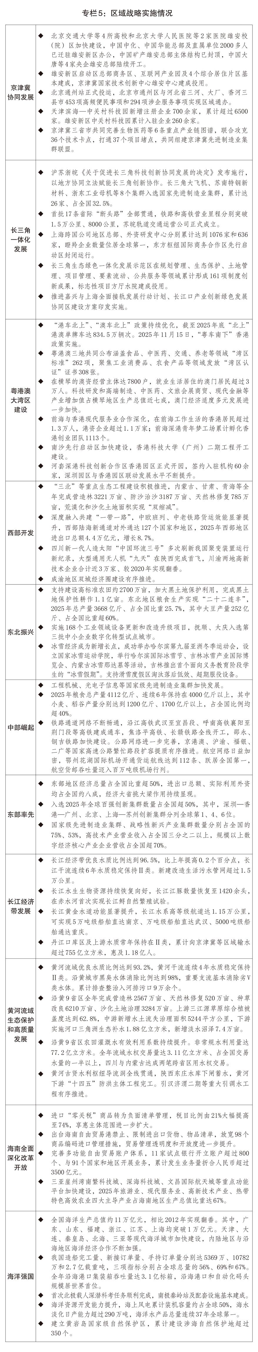一是深化實施區(qū)域戰(zhàn)略。穩(wěn)妥有序推進北京非首都功能疏解項目落地,加快建設(shè)現(xiàn)代化首都都市圈,推動形成更加緊密的京津冀協(xié)同發(fā)展格局,增強雄安新區(qū)內(nèi)生發(fā)展動力和人氣活力。以上?!拔鍌€中心”建設(shè)為牽引,發(fā)揮蘇浙皖比較優(yōu)勢,協(xié)同強化長三角地區(qū)全球資源配置能力,進一步推動長三角生態(tài)綠色一體化發(fā)展示范區(qū)功能升級,支持上海與蘇州推進重點領(lǐng)域同城化發(fā)展。持續(xù)深化粵港澳規(guī)則銜接、機制對接,有序推進職業(yè)資格互認、數(shù)據(jù)跨境流動等,發(fā)揮橫琴、前海、南沙、河套等合作平臺先行先試作用,推動市場要素跨境便捷流動,以琴澳一體化推動粵港澳大灣區(qū)市場一體化建設(shè)。促進特色優(yōu)勢產(chǎn)業(yè)和產(chǎn)業(yè)協(xié)作園區(qū)發(fā)展,推動西部大開發(fā)加快形成新格局。支持東北地區(qū)強化戰(zhàn)略支撐能力,依托制造業(yè)基礎(chǔ)推動產(chǎn)業(yè)體系現(xiàn)代化,將產(chǎn)業(yè)、科教、農(nóng)業(yè)、生態(tài)等資源優(yōu)勢轉(zhuǎn)化為發(fā)展成效。強化中部地區(qū)糧食、煤炭等重要物資保障,發(fā)揮完整產(chǎn)業(yè)體系和配套能力優(yōu)勢,加快建設(shè)內(nèi)陸開放高地。扎實推動?xùn)|部地區(qū)加快推進現(xiàn)代化,在科技創(chuàng)新、產(chǎn)業(yè)發(fā)展、改革開放等方面繼續(xù)走在前列。支持高質(zhì)量建設(shè)兩岸融合發(fā)展示范區(qū)。加力推進長江大保護三年行動計劃落實,實施好長江十年禁漁,加大旗艦物種拯救行動實施和重要棲息地生態(tài)修復(fù)力度,推動沿江產(chǎn)業(yè)綠色低碳發(fā)展。系統(tǒng)推進黃河流域上游水源涵養(yǎng)、中游水土保持、下游濕地保護和生態(tài)治理,提高流域水生態(tài)系統(tǒng)穩(wěn)定性,促進上中下游協(xié)調(diào)聯(lián)動發(fā)展。扎實推進海南自由貿(mào)易港建設(shè),加快貿(mào)易、投資等重點領(lǐng)域改革開放。