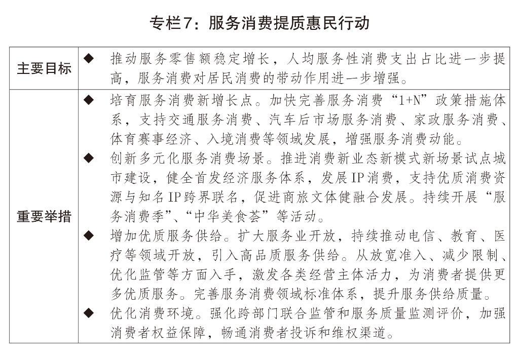一是推動消費持續(xù)增長。深入實施提振消費專項行動。制定實施城鄉(xiāng)居民增收計劃。完善最低工資標(biāo)準調(diào)整機制,加強最低工資標(biāo)準國家統(tǒng)籌與分類指導(dǎo),引導(dǎo)企業(yè)構(gòu)建技能導(dǎo)向的工資分配制度。引導(dǎo)上市公司更加積極開展現(xiàn)金分紅、回購注銷,增加居民財產(chǎn)性收入。設(shè)立1000億元財政金融協(xié)同促內(nèi)需專項資金,組合運用貸款貼息、融資擔(dān)保、風(fēng)險補償?shù)确绞街С謹U大內(nèi)需。擴大優(yōu)質(zhì)消費供給,推動商品消費擴容升級,深入實施服務(wù)消費提質(zhì)惠民行動,出臺服務(wù)消費、首發(fā)經(jīng)濟、賽事經(jīng)濟、電子商務(wù)、“人工智能+消費”、IP消費等促進政策,大力發(fā)展銀發(fā)經(jīng)濟、冰雪經(jīng)濟,豐富嬰童產(chǎn)品、時尚“潮品”、適老化產(chǎn)品、農(nóng)業(yè)精品品牌等,深化線上線下、商旅文體健多業(yè)態(tài)消費融合,推進消費新業(yè)態(tài)新模式新場景試點?;钴S線下消費,激發(fā)下沉市場消費活力。擴大個人消費貸款和服務(wù)業(yè)經(jīng)營主體貸款貼息政策支持領(lǐng)域,提高貼息上限,延長實施期限。