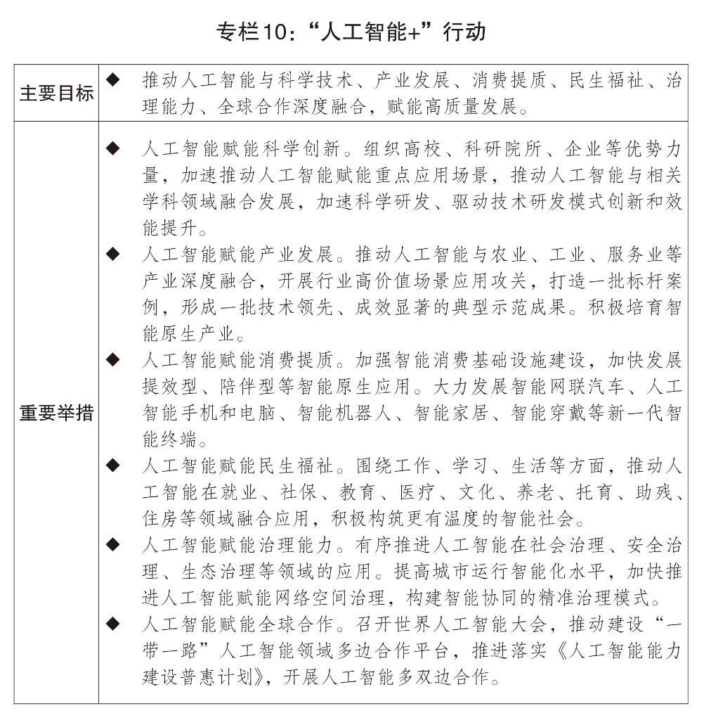 四是深入推進數(shù)字中國建設(shè)。深入實施“人工智能+”行動,高質(zhì)量建設(shè)國家人工智能應(yīng)用中試基地,推動人工智能在重點行業(yè)領(lǐng)域商業(yè)化規(guī)模化應(yīng)用。支持人工智能開源社區(qū)建設(shè),促進模型、工具、數(shù)據(jù)集等匯聚開放。發(fā)展新一代智能終端以及模型即服務(wù)、智能體即服務(wù)等新產(chǎn)品新業(yè)態(tài)。加快建設(shè)全國一體化算力網(wǎng),優(yōu)化國家算力資源布局,支持公共云發(fā)展。推動完善人工智能領(lǐng)域法律法規(guī)。加快構(gòu)建人工智能安全風(fēng)險防治體系。健全數(shù)據(jù)要素基礎(chǔ)制度,出臺建設(shè)全國一體化數(shù)據(jù)市場的政策,積極推進數(shù)據(jù)流通利用基礎(chǔ)設(shè)施建設(shè)和運營,深入推進數(shù)據(jù)要素綜合試驗區(qū)建設(shè)。加快公共數(shù)據(jù)資源開放共享和開發(fā)利用,深入推進可信數(shù)據(jù)空間創(chuàng)新發(fā)展試點、數(shù)據(jù)產(chǎn)業(yè)集聚區(qū)建設(shè)試點。構(gòu)建數(shù)字產(chǎn)業(yè)集群梯次布局體系,高質(zhì)量推進數(shù)字經(jīng)濟創(chuàng)新發(fā)展試驗區(qū)建設(shè)。實施數(shù)據(jù)賦能工程,建設(shè)數(shù)智化轉(zhuǎn)型促進網(wǎng)絡(luò)。推進城市全域數(shù)字化轉(zhuǎn)型。實施工業(yè)互聯(lián)網(wǎng)創(chuàng)新發(fā)展工程。強化平臺經(jīng)濟常態(tài)化監(jiān)管,推動平臺企業(yè)和平臺內(nèi)經(jīng)營者、勞動者共贏發(fā)展。