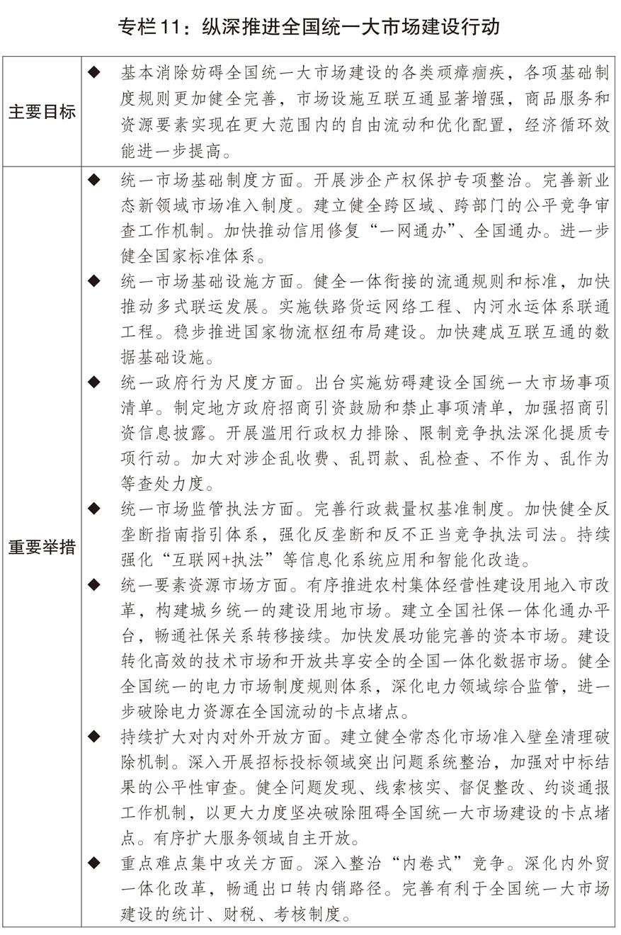 一是加快破除阻礙全國統(tǒng)一大市場建設(shè)卡點堵點。制定全國統(tǒng)一大市場建設(shè)條例、縱深推進全國統(tǒng)一大市場建設(shè)工作方案,持續(xù)清理和廢除妨礙全國統(tǒng)一市場和公平競爭的各種規(guī)定和做法。推動市場準入效能評估省、市、縣三級全覆蓋。出臺地方政府招商引資鼓勵和禁止事項清單,規(guī)范稅收優(yōu)惠、財政補貼政策。深化綜合交通運輸體系改革,持續(xù)降低全社會物流成本,健全高效順暢的現(xiàn)代流通體系,加快市場基礎(chǔ)設(shè)施高標(biāo)準聯(lián)通相關(guān)改革,實施多式聯(lián)運攻堅行動,深入推進“一單制”、“一箱制”發(fā)展。繼續(xù)推動大宗商品骨干流通走廊建設(shè),加快建設(shè)大宗商品資源配置樞紐,提高國家物流樞紐、國家骨干冷鏈物流基地、國家郵政快遞樞紐的物流集散和區(qū)域輻射能力??v深推進全國統(tǒng)一電力市場建設(shè)。加快推動制修訂社會信用建設(shè)法、價格法等。深化統(tǒng)計、財稅、考核制度改革,完善有利于全國統(tǒng)一大市場建設(shè)的激勵約束機制。