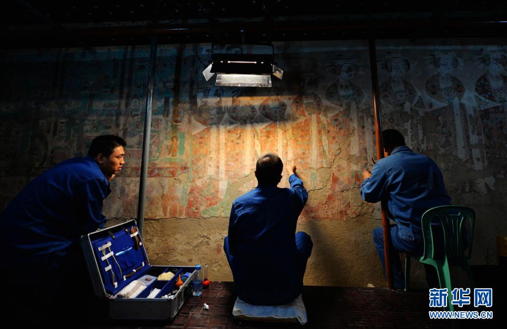 敦煌研究院技術(shù)人員在莫高窟98窟內(nèi)對病害壁畫進(jìn)行修復(fù)(2014年9月3日攝)。新華社記者 陳斌 攝