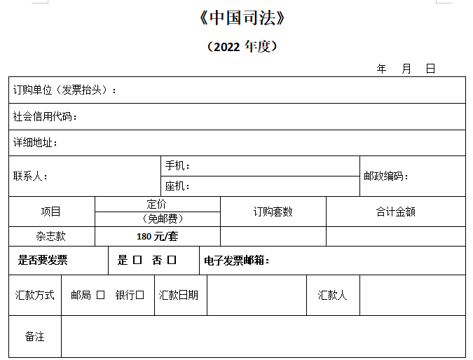單位匯款時請務(wù)必標(biāo)明“中國司法+訂購套數(shù)”,個人匯款請務(wù)必注明“單位名稱+中國司法”。