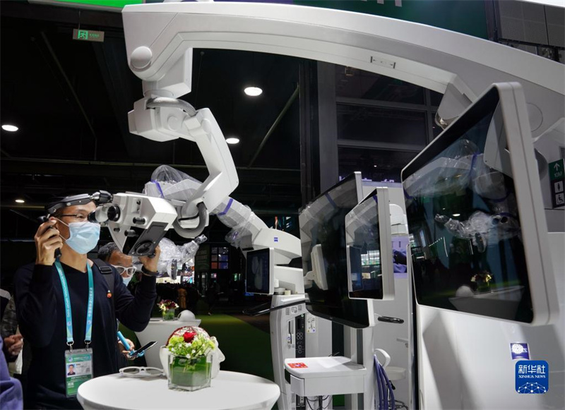 在第三屆中國國際進口博覽會醫(yī)療器械及醫(yī)藥保健展區(qū)蔡司集團展臺,參觀者體驗手術(shù)顯微鏡(2020年11月6日攝)。新華社記者 劉穎 攝
