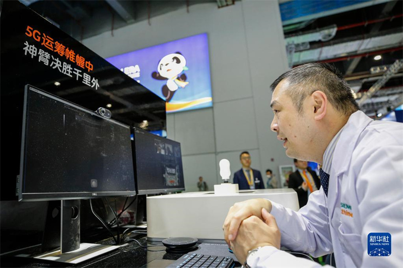 一位超聲科醫(yī)生在第二屆中國國際進口博覽會上使用西門子5G醫(yī)療遠程超聲解決方案,與重慶市彭水苗族土家族自治縣紹慶街道社區(qū)衛(wèi)生服務(wù)中心?的超聲醫(yī)生進行遠程實時高清超聲圖像傳輸和音視頻對話(2019年11月6日攝)。新華社記者 張玉薇 攝