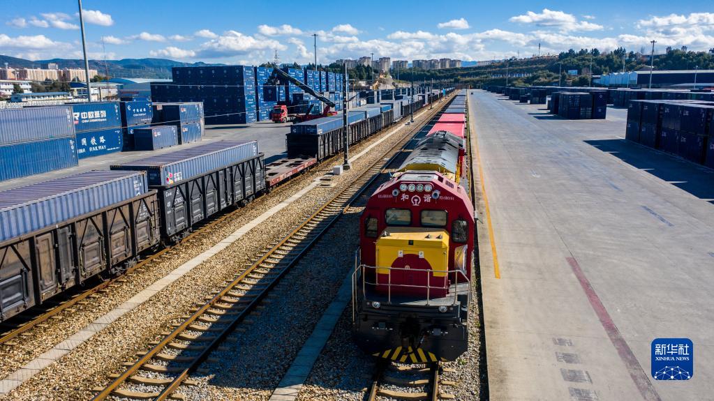 滿載30個標準集裝箱的中老鐵路新年首趟國際貨物列車停靠在中鐵聯(lián)集昆明中心站(2022年1月1日攝,無人機照片)。新華社記者 胡超 攝