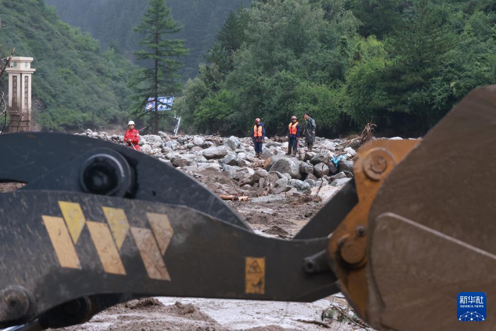 8月8日,救援人員在榆中縣馬坡鄉(xiāng)山洪災害現(xiàn)場排查險情,引導救援車輛進入。新華社發(fā)(金萬貴攝)