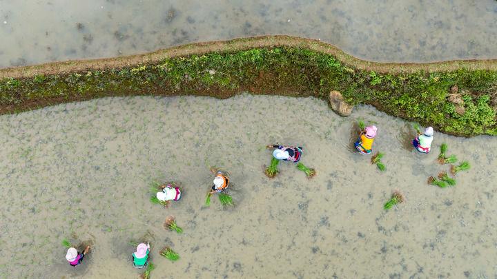 2025年5月2日,在云南省紅河縣甲寅村,村民在梯田里插秧(無人機(jī)照片)。新華社記者 胡超 攝