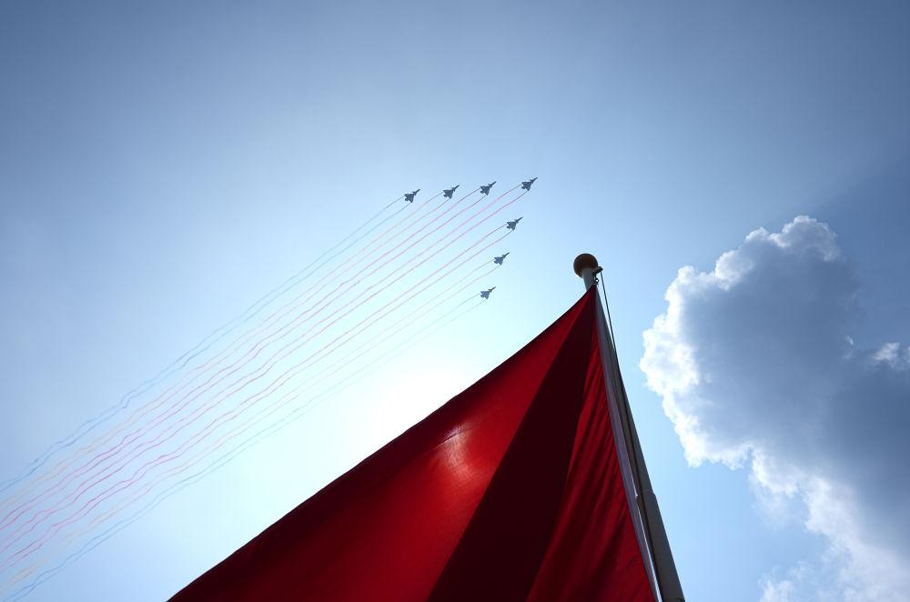 2025年9月3日,紀(jì)念中國人民抗日戰(zhàn)爭暨世界反法西斯戰(zhàn)爭勝利80周年大會(huì)在北京隆重舉行。這是教練機(jī)梯隊(duì)接受檢閱。新華社記者 朱崢 攝