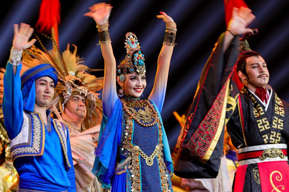 2022年4月22日,在新疆藝術(shù)劇院木卡姆藝術(shù)團(tuán)劇場(chǎng),舞蹈演員馬依熱·艾買(mǎi)提江(中)在舞劇《張騫》演出后向觀眾致謝。馬依熱來(lái)自烏魯木齊,11歲時(shí)前往北京跟隨專(zhuān)業(yè)舞蹈老師學(xué)習(xí),學(xué)成后回到家鄉(xiāng),成為新疆藝術(shù)劇院歌舞團(tuán)的一名舞蹈演員?!靶陆母栉枋侵腥A傳統(tǒng)文化的一部分,是用來(lái)歌頌美好生活的。希望我的舞蹈,能增進(jìn)各民族間的感情,促進(jìn)文化交融。”馬依熱說(shuō)。