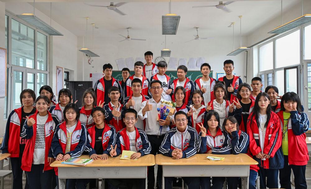 2024年9月10日,在新疆阿拉爾職業(yè)技術(shù)學(xué)校,援疆教師李斌傲(中)和23級(jí)電商班的學(xué)生合影。“95后”年輕教師李斌傲是第十一批浙江臺(tái)州到新疆阿拉爾職業(yè)技術(shù)學(xué)校援疆教師中的一員,負(fù)責(zé)教授電子商務(wù)專(zhuān)業(yè)課程。他在學(xué)校主導(dǎo)籌建了電商實(shí)訓(xùn)室,還帶了4個(gè)新入職的教師當(dāng)徒弟?!芭嘤?xùn)好本地教師,就是打造一支帶不走的隊(duì)伍?!崩畋蟀琳f(shuō)。