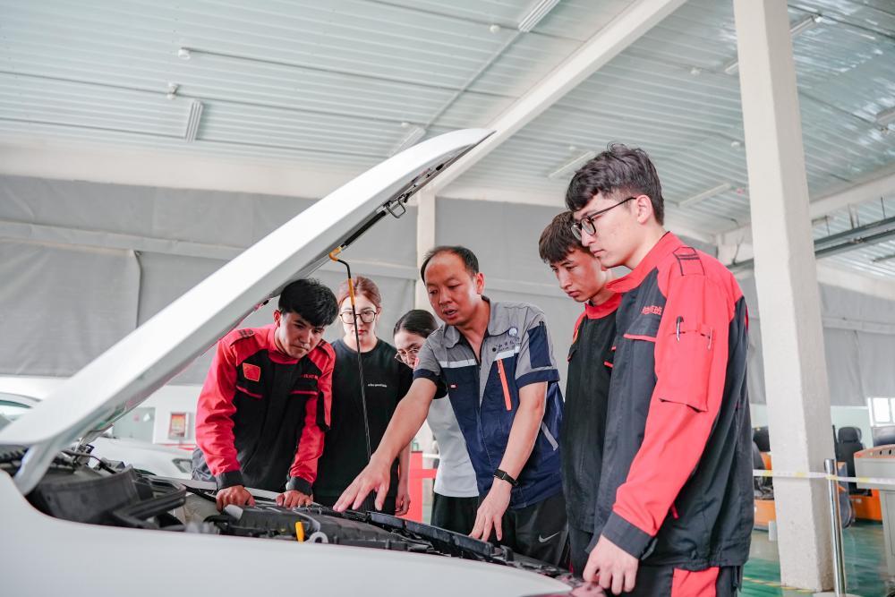 2025年6月27日,在新疆和田技師學(xué)院,援疆教師李寶(中)和當(dāng)?shù)亟處熞煌笇?dǎo)學(xué)生維修汽車(chē)。該校是北京市對(duì)口援疆幫扶單位之一,2020年以來(lái),北京市向該校派出3批次累計(jì)30人次的援疆教師隊(duì)伍,他們?cè)趨⑴c學(xué)校管理、承擔(dān)教學(xué)任務(wù)的基礎(chǔ)上,還主動(dòng)開(kāi)展“傳幫帶”培養(yǎng)當(dāng)?shù)亟處煟e極組織和指導(dǎo)學(xué)生參與各類(lèi)技能競(jìng)賽,為當(dāng)?shù)芈殬I(yè)技術(shù)教育高質(zhì)量發(fā)展貢獻(xiàn)力量。