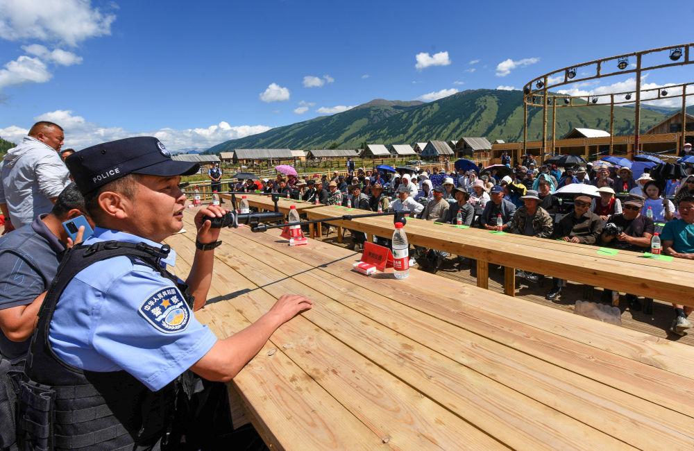 2024年7月22日,在新疆阿勒泰地區(qū)布爾津縣禾木哈納斯蒙古族鄉(xiāng)哈納斯村,喀納斯邊境派出所民警在村民大會(huì)上給村民宣講邊境法律法規(guī)。近年來(lái),喀納斯邊境派出所通過(guò)“警村企黨支部聯(lián)合工作站”模式,聯(lián)合當(dāng)?shù)厝罕?、景區(qū)一起解決游客難題,大大提升了警務(wù)效率,逐步形成了“景中警 貼心人”的旅游警務(wù)品牌。