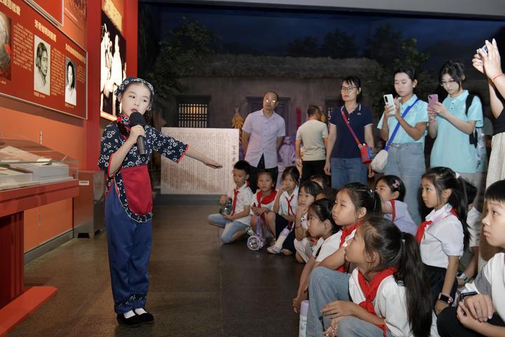 2025年8月7日,在山東省臨沂市沂蒙革命紀(jì)念館,沂蒙紅孩子文藝先鋒隊的房沫昕在講述紅色故事《沂蒙紅嫂祖秀蓮》。2024年9月,位于沂蒙革命老區(qū)的山東省臨沂市以“傳承沂蒙精神”為宗旨組建沂蒙紅孩子文藝先鋒隊,通過歌舞、朗誦、故事講述、舞臺劇等紅色主題文藝節(jié)目,增強(qiáng)紅色文化感染力,不斷為紅色基因代代相傳注入新生力量。